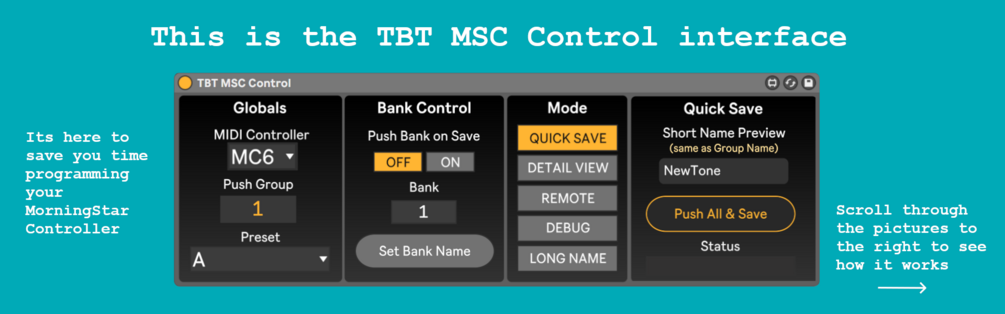 - Remotely switch banks and presets on Morningstar midi controllers within Ableton (MC3, MC6 MKII, MC8) as was rename the bank or long name.